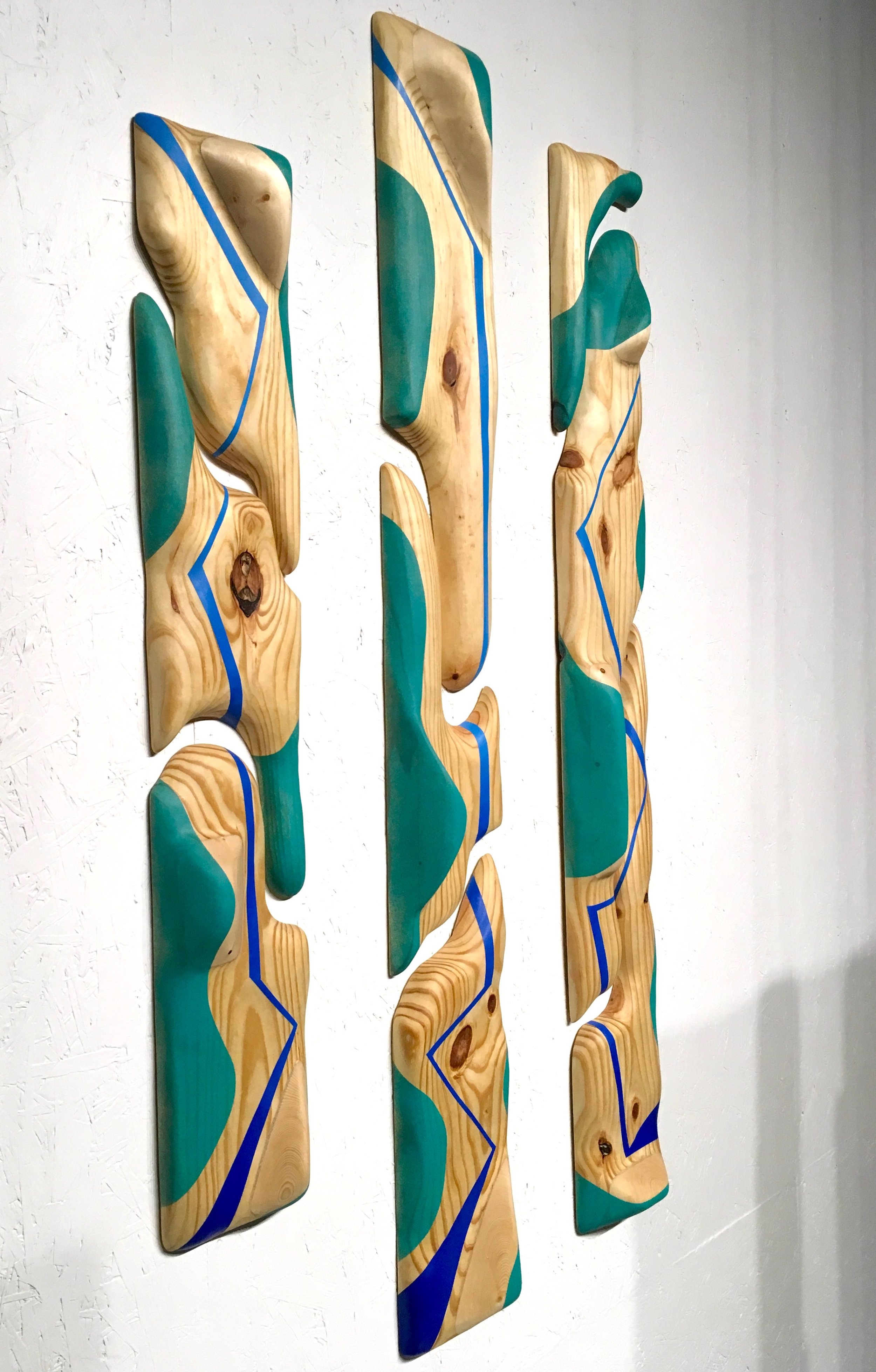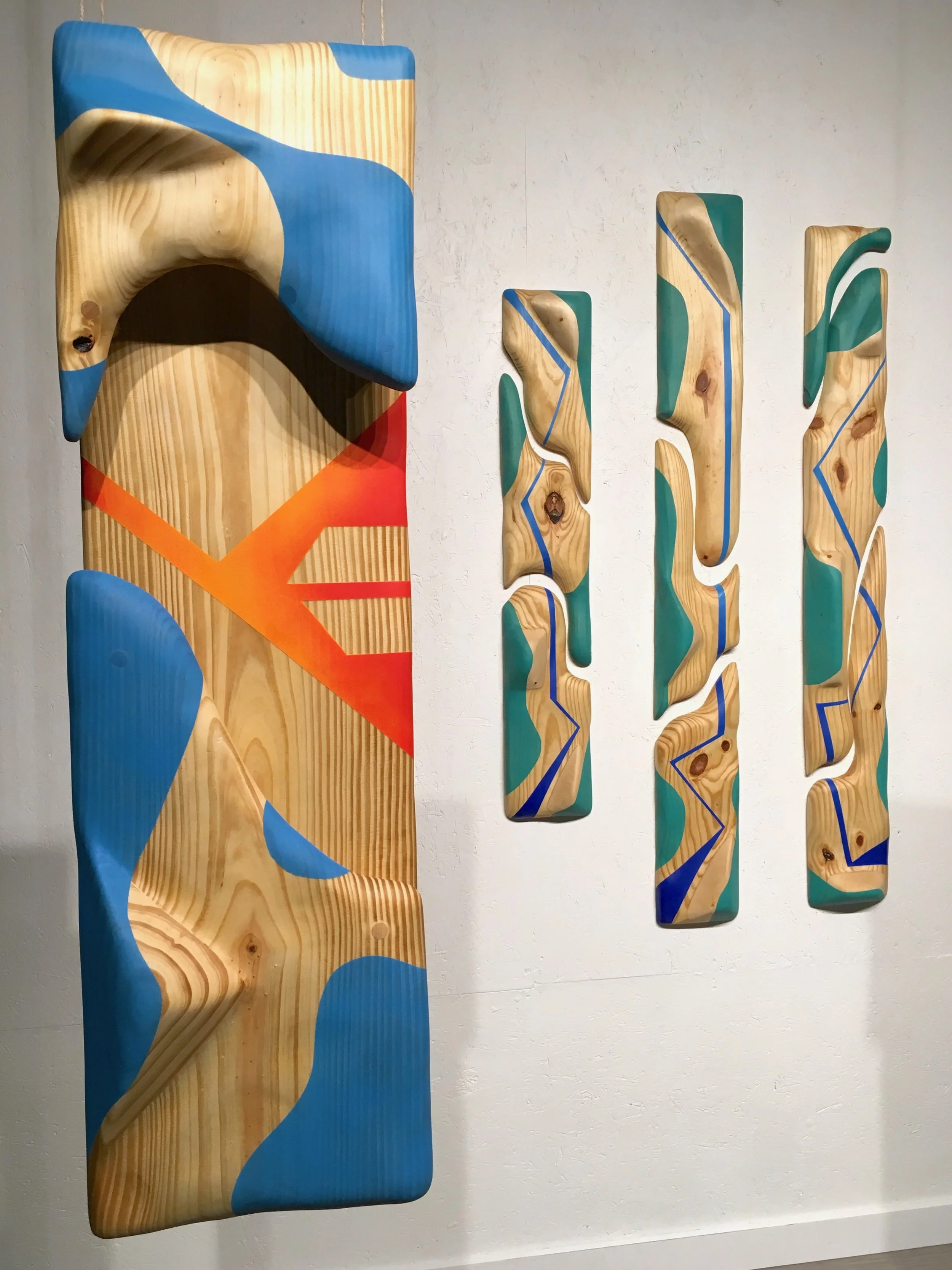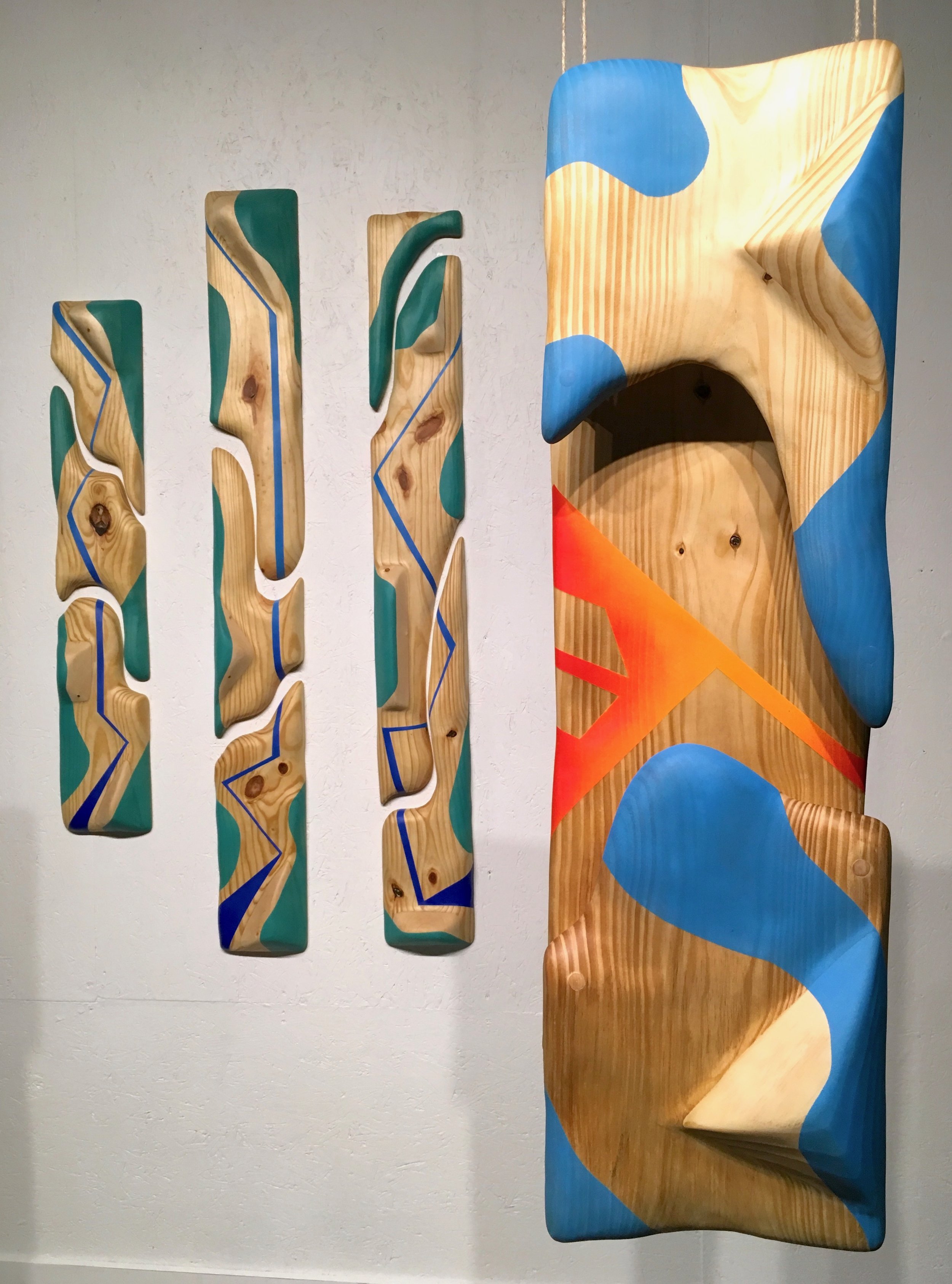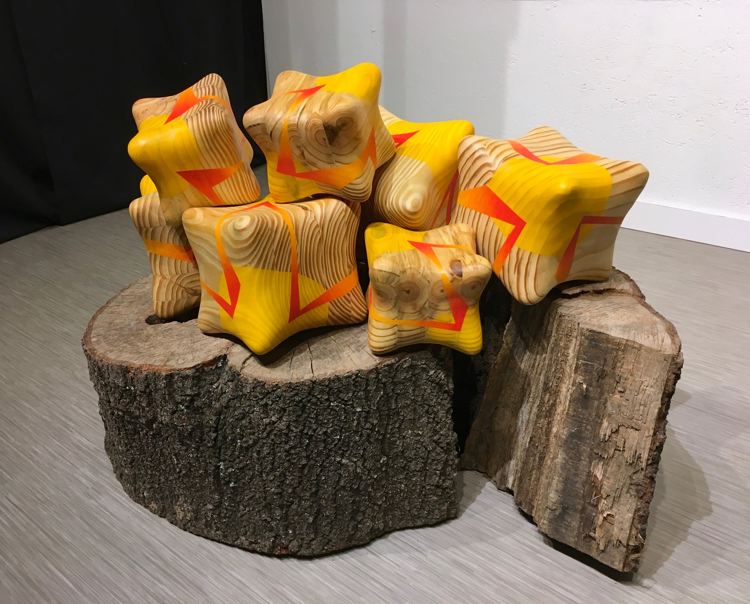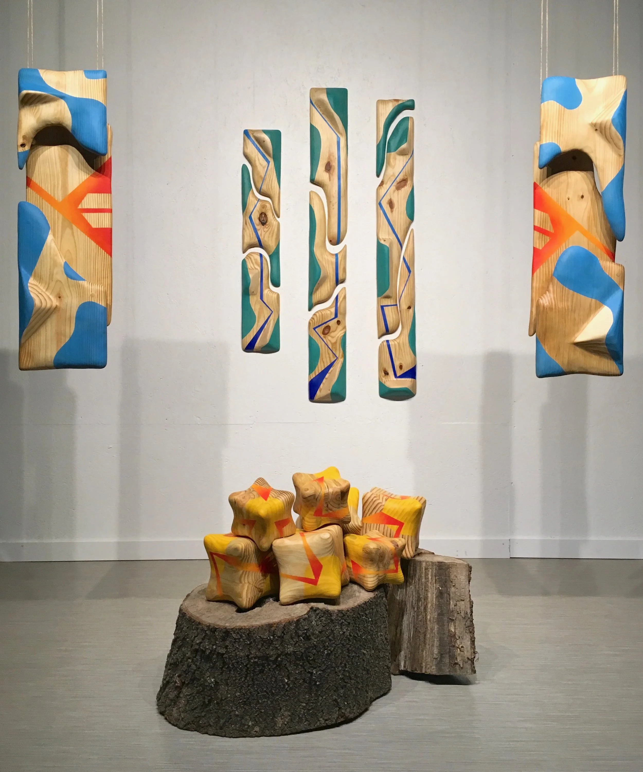 This installation was created in a custom space in Pluskota’s studio. It features colorful, imaginative sculptures that abstractly represent elements of a landscape and the stories that go with it, which are introduced by the individuals who enter the space.