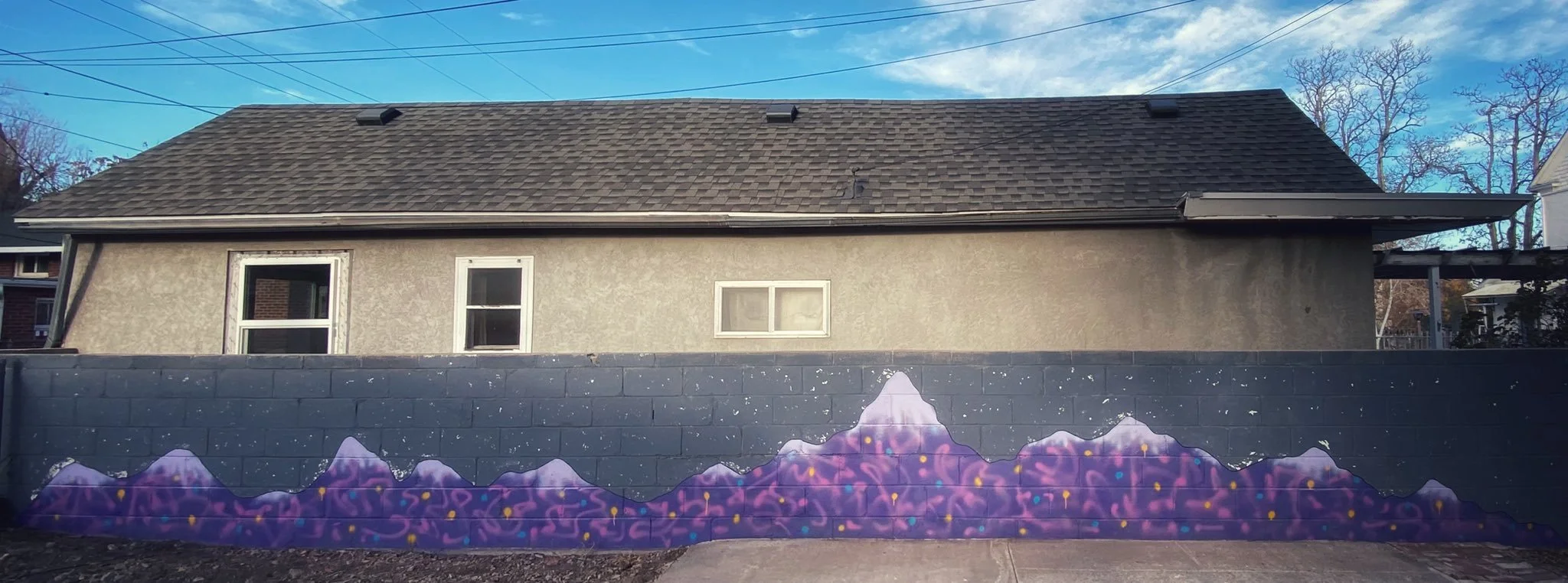 Mountain mural, Spray paint and marker on cinderblock, 2022